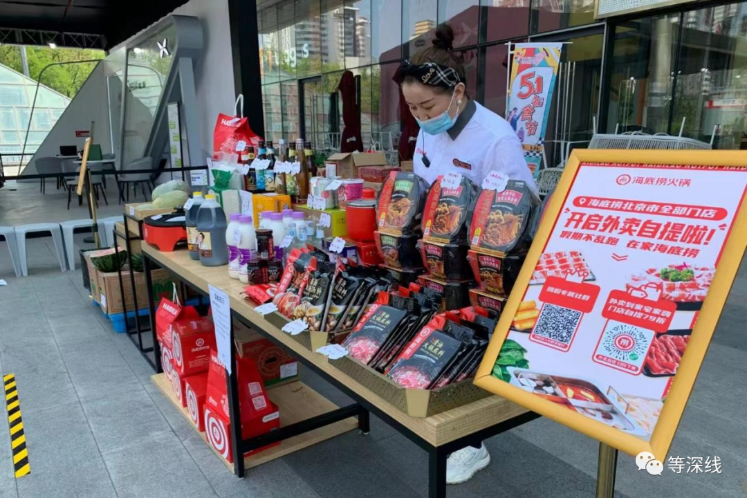 5月的北京,很多昔日繁華的商場門口,擺著一個個貨架,上面有一些水果、蔬菜和自制方便食品,赫然貼著海底撈顯眼的商標。