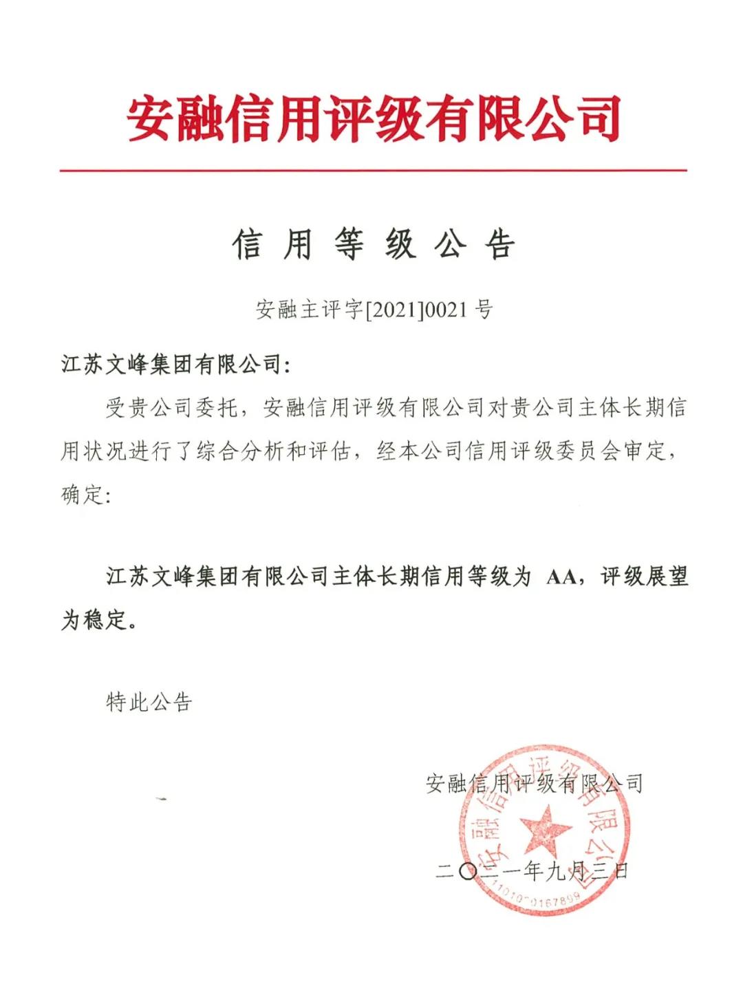 江蘇文峰集團主體長期信用等級獲評AA!展望穩(wěn)定