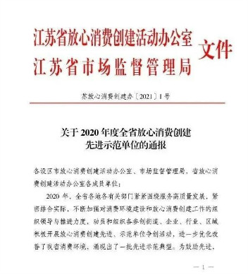 近日,江蘇省放心消費創建活動辦公室和江蘇省市場監督管理局聯合發文,表彰了一批2020年度全省放心消費創建先進示范單位,江蘇文峰集團旗下多家單位憑借優異的表現獲得了此項殊榮。