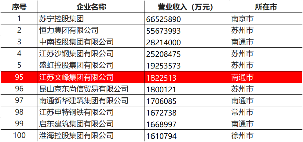 9月21日,江蘇省工商業聯合會發布了“2020江蘇省民營企業百強”榜單。江蘇文峰集團以182.25億元的營業收入,名列“2020江蘇省民營企業百強”第95位。