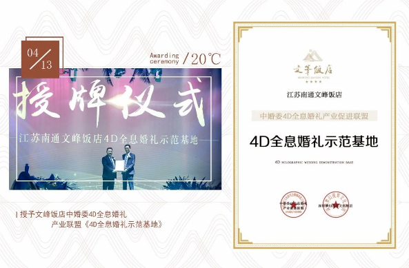 2019年4月,文峰飯店舉辦了《2019春季4D全息婚SHOW星光文化展》,南通市原副市長、旅游協(xié)會會長朱晉;南通市委宣傳部文化改革發(fā)展處處長顧凡;南通市商務局副局長楊丁勇等領(lǐng)導出席了活動,中婚委4D全息婚禮產(chǎn)業(yè)聯(lián)盟授予文峰飯店《4D全息婚禮示范基地》。