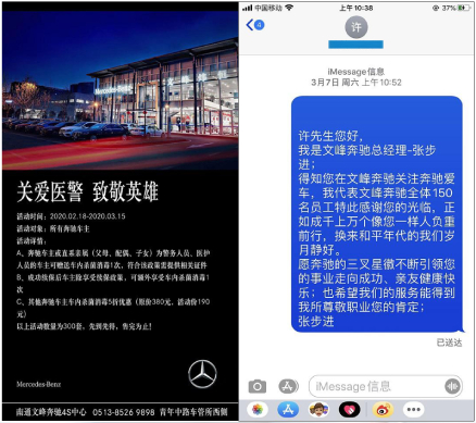 疫情并沒有阻隔我們向英雄致敬,在全國疫情緊張的情況下,南通當地醫療救援隊也支援了武漢。為致敬英雄,南通文峰奔馳店對所有醫護人員、警務人員車主提供了免費車內殺菌消毒服務,奔馳店負責人還向英雄們發送了致敬關愛短信。