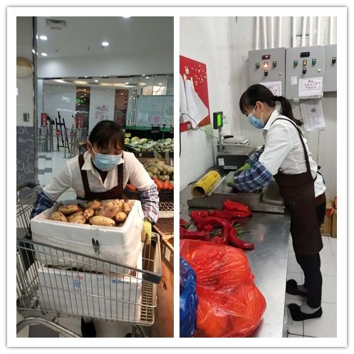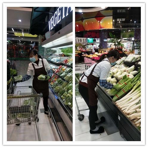 疫情期間,生鮮部門的客流量明顯增加,工作量達到了平時的三至四倍,經常出現前腳剛上完貨,等走到下個柜臺時貨柜就空了的情況。